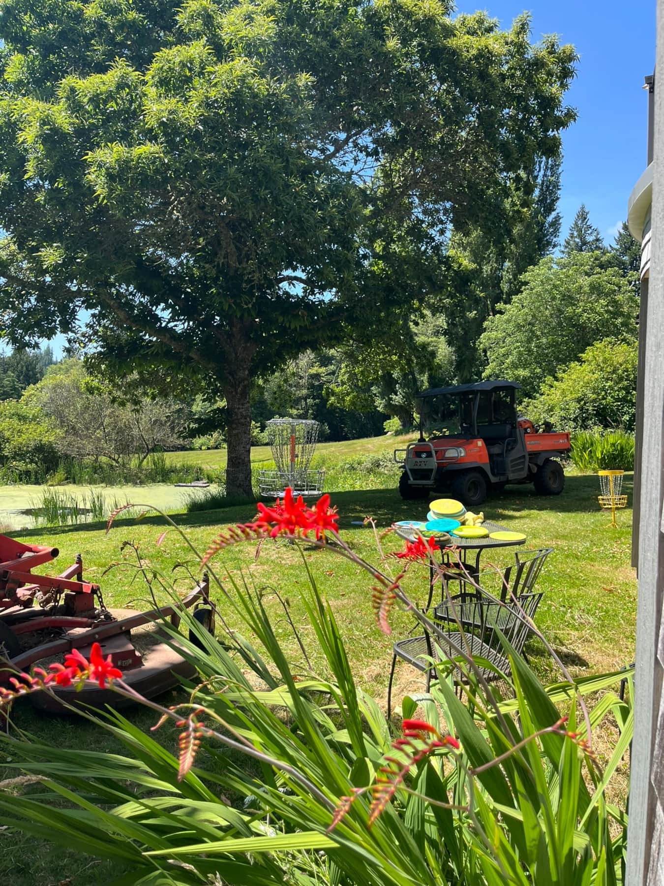 A shorter but still challenging layout that plays across the lower pasture and over the pond. It’s perfect for a warm-up round, family play, or quick fun before sunset.